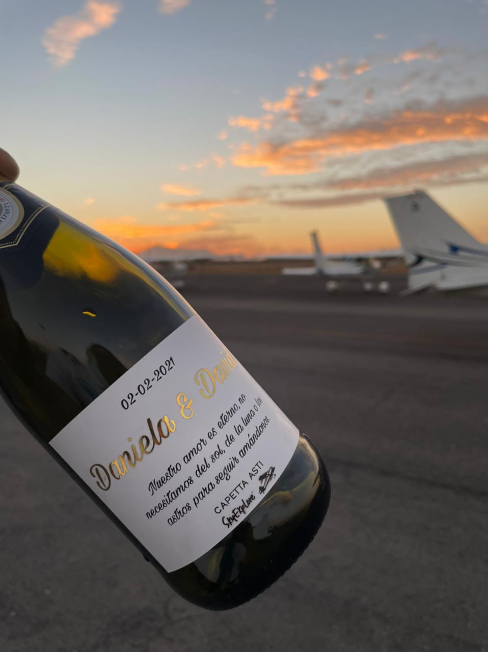 ✅1 botella de vino espumoso PERSONALIZADA para brindar durante el vuelo